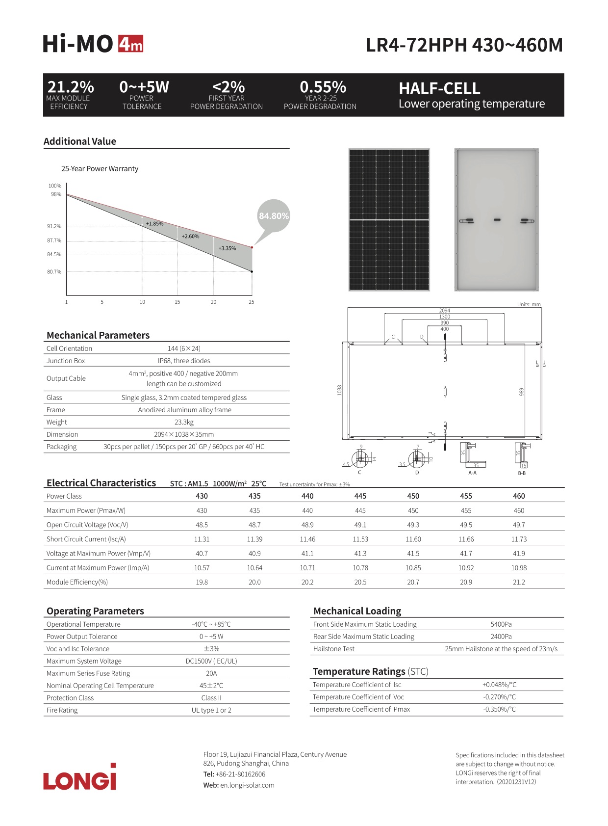LONGi dodává panely s 10-ti letou zárukou na výrobek a 25 let na výkon. Firma byla založena roku 2000 a panely vyrábí od roku 2007. Certifikace: UL 1703, IEC 61215, IEC 61730, výroba probíhá podle ISO 9001/14001.
